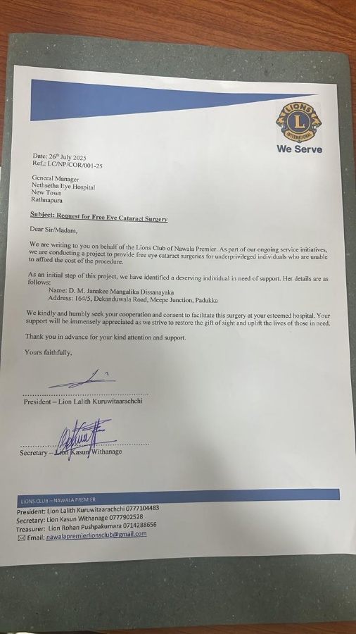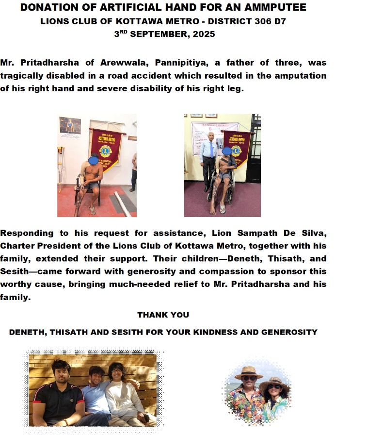 On July 10, 2025, a wheelchair was donated to a patient in Anuradhapura. The wheelchair was dispatched from Colombo and sent by bus to the recipient. The project was funded and chaired by Lion Aruna ...