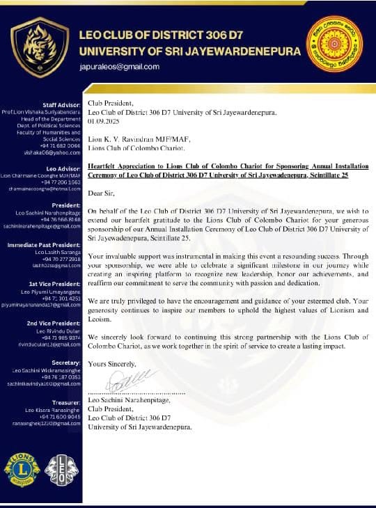 Sponsorship for Leo Club of Sri Jajawardana pura Univercity