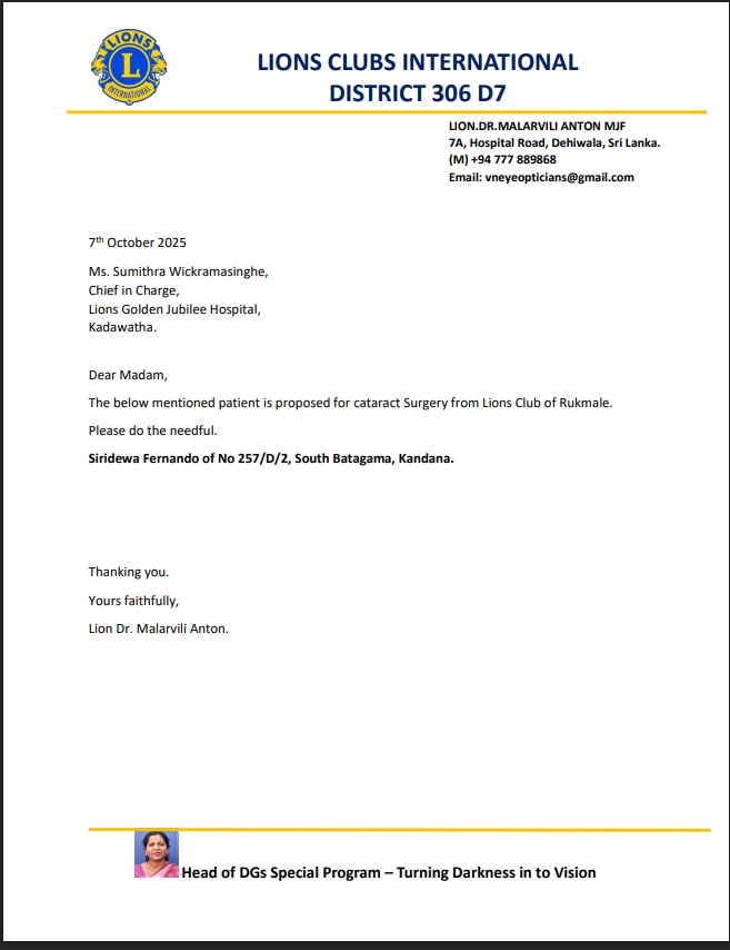 Recommended 2 persons for Catact surgery. Surgeries successully conducted on 14th October at Lions Golden Jubilee Hospital - Kadawatha Project Chairperson : Lion Lady Rohini Abeysinghe