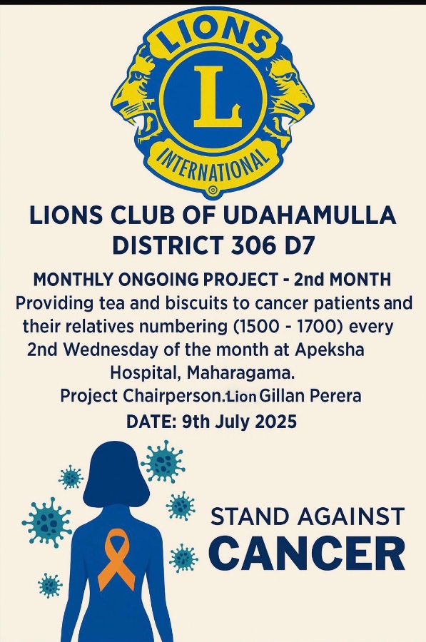 Monthly ongoing project providing tea and biscuits to cancer patients and their relatives numbering (1500-1700) every 2nd Wednesday of the month at Apeksha hospital Maharagama. Project chairperson Lio...