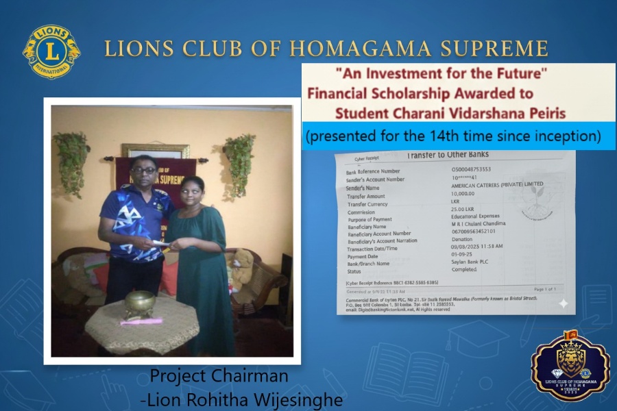The Lions Club of Homagama Supreme successfully continued its noble humanitarian initiative, “An Investment for the Future,” by awarding a financial scholarship to student Charani Vidarshana Peiri...