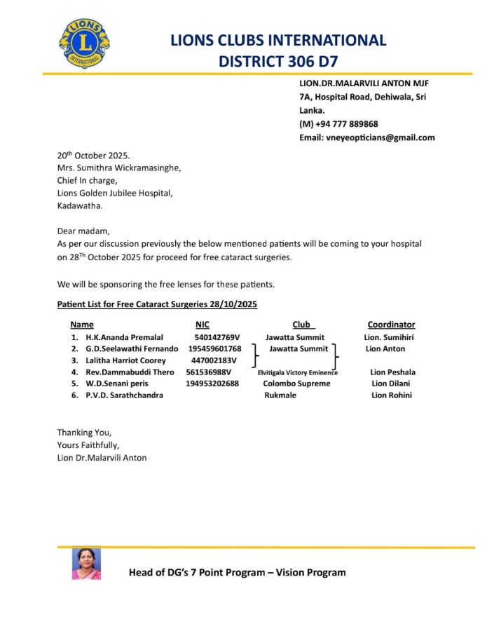 Recommended a persons for Catact surgery. Project Chairperson : Lion Lady Rohini Abeysinghe