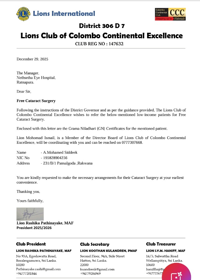Letters were provided to 07 low-income patients to get services from Nethsetha Lions Eye Hospital in Ratnapura and Kadawatha for free cataract surgery.