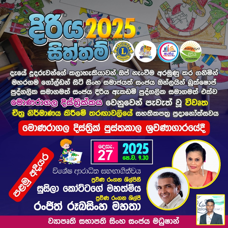 In line with the annual art competition program Monaragala District Chapter 01 program was organized on 27th December 2025. after screening over 1000 students we manage to gather over 250 students into the auditorium. We sponsored entire art materials for over 1000 students, auditorium venue fee, Refreshments for all, gifts, certificates, medals, expense for artists from colombo, transport facilities etc. ( 110,000/-+ 65,000/-+42,000/-+25000/-+14500/-+16500/-+50000/-+ 75000*/+12000/-)
