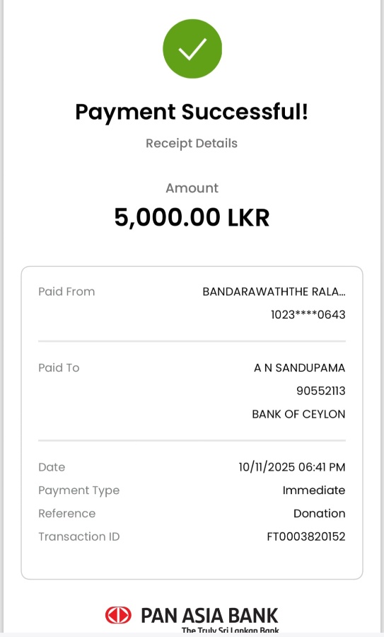 Cash Donation of Rs 5000/- per/month July Aug Sep Oct 25 To Student from Nallamudawa School in Anuradhpura