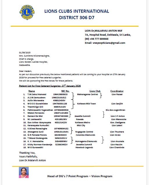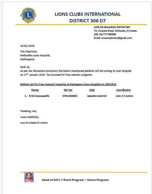 Lions Club of Jawatta Summit Sponsered for 18 Free Cataract Surgeries for the month of January for Underprivileged Patients nominated by various clubs throughout the island.